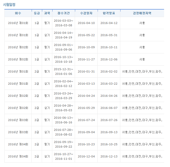 1급 시험의 경우는 서울만 응시할 수 있고 2급 시험은 서울,인천,대전,대구,부산,광주 6곳에서 시행을 합니다
