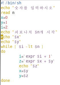 3) "let" 또는 "expr" 명령을 사용하여 피보나치 수열을 나타내는 쉘 스크립트를 작성하시오.