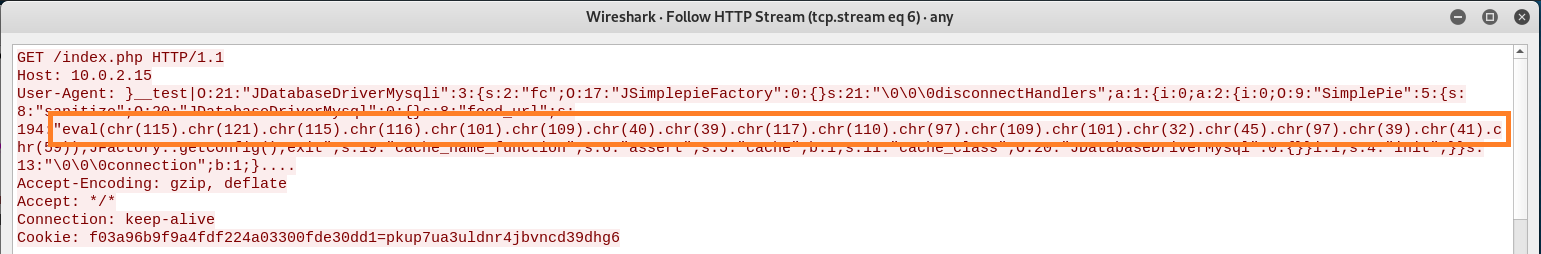 와이어샤크 HTTP STREAM 확인시 User-Agent에 취약점 코드 삽입.