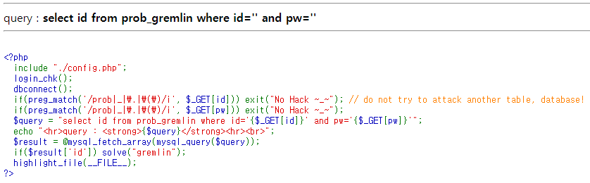 $_GET[id], $_GET[pw]를 통해서 2개의 파라미터를 받지만 '#' 이나 '--'으로 이어지는 구문을 생략할 수 있으므로