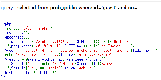 where id='guest' (=True) and no=1 (=True) (뒷 구문은 비교하지 않고 결과 출력)