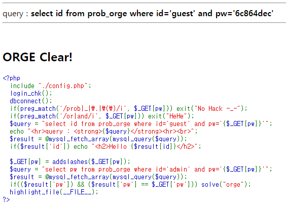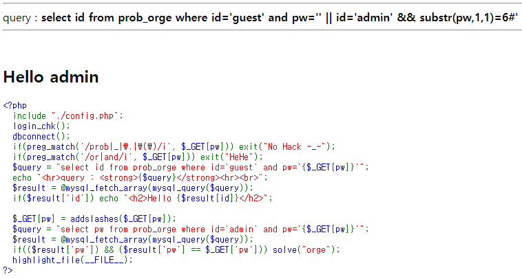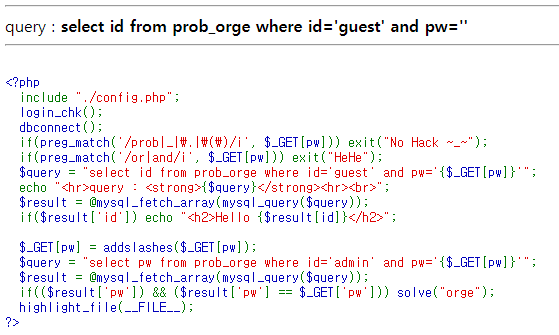 preg_match('/or|and/i', $_GET[pw]) 함수로 인해 sql 쿼리에 or 및 and를 사용할 수 없습니다.