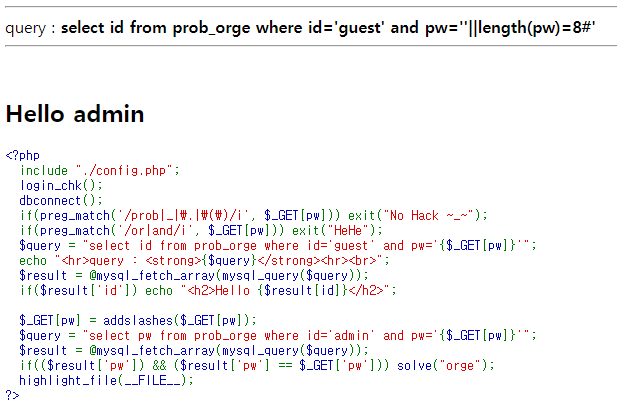 URL 파라미터에 ?pw=' || length(pw)=8%23 를 입력하면 위와 같이 'Hello admin' 메시지가 나옵니다.