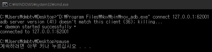 - 메모장에 아래와 같이 "nox_adb.exe 파일 경로" connect [localhost]:62001 을 작성한 후 bat파일 생성