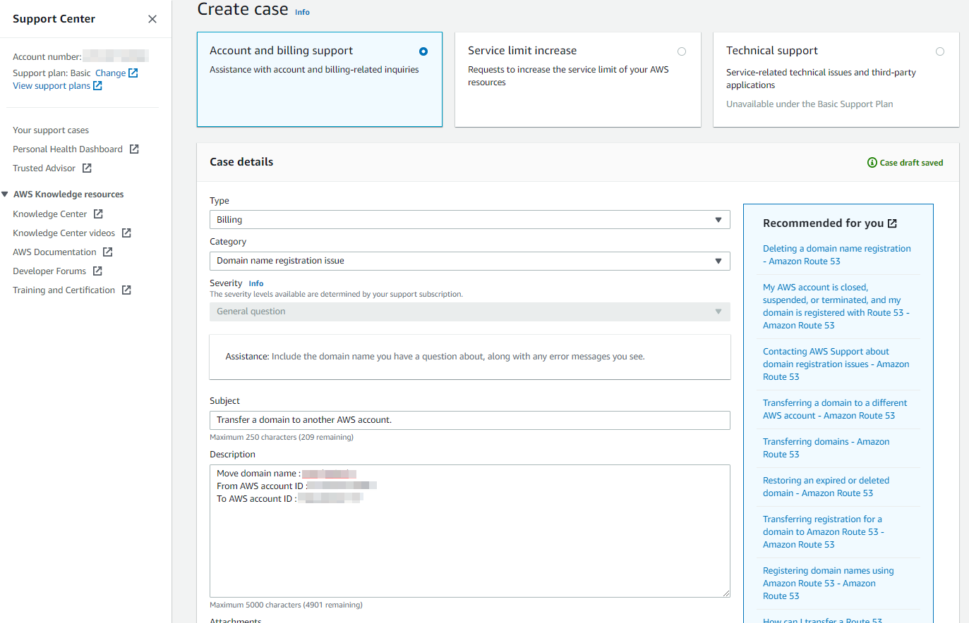 5. Create case > Account and billing support > Case details