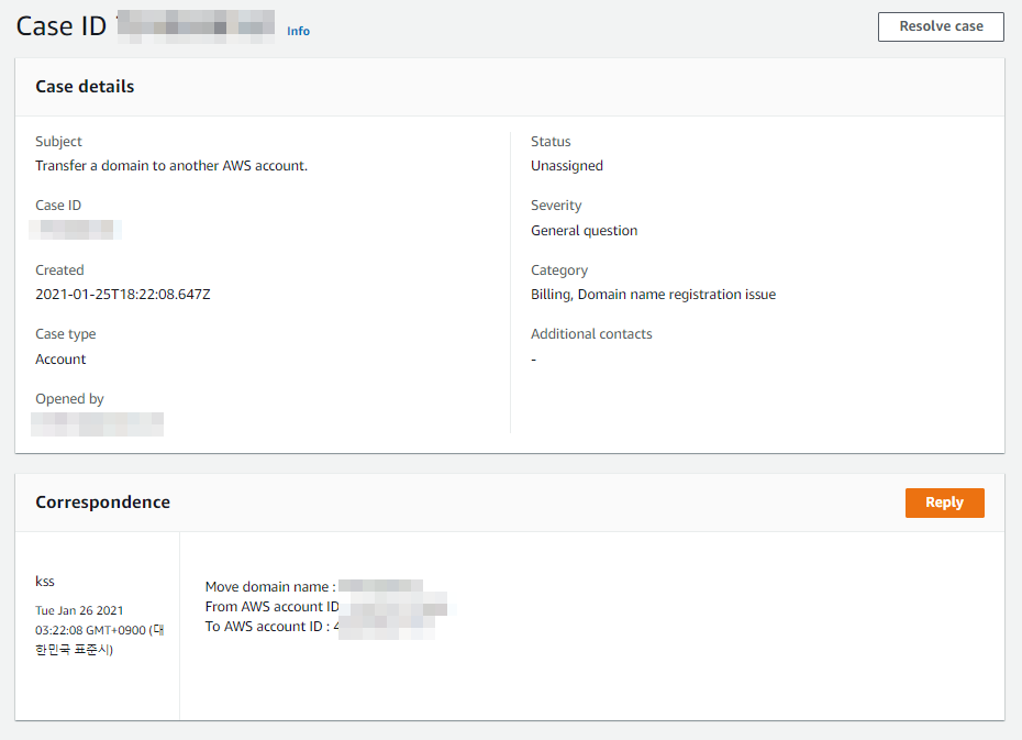 Route 53 도메인 계정 이전 신청