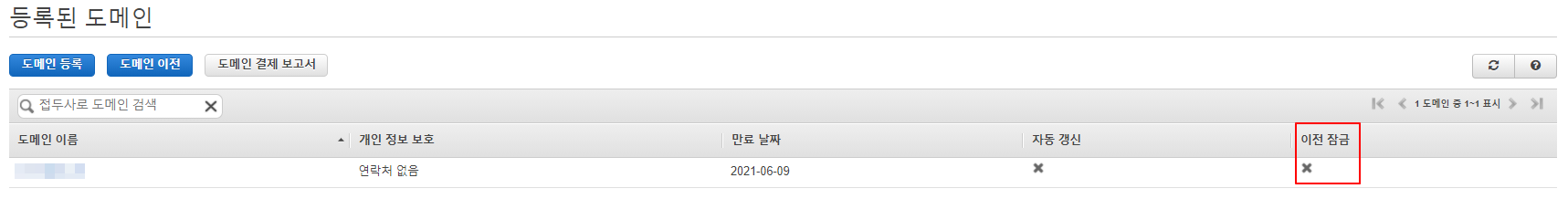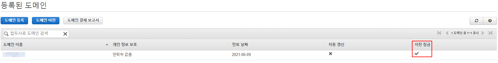 1. 현재 등록 된 도메인 확인 2개가 등록되어 있다. 1개는 이전 잠금이 되어 있고, 1개는 이전 잠금 해지가 되어 이전 가능하다. 두 도메인 모두 다른 AWS 계정으로 이전할 예정이라 도메인을 ��