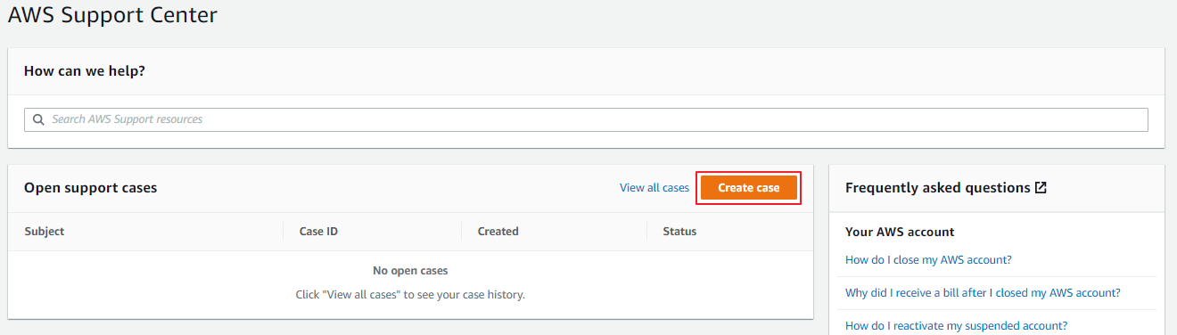 4. 지원(우측 상단) > 지원센터 > Create case