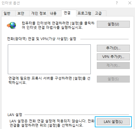- 우측 상단 '톱니바퀴' - '인터넷 옵션' - '연결' - 'LAN 설정'