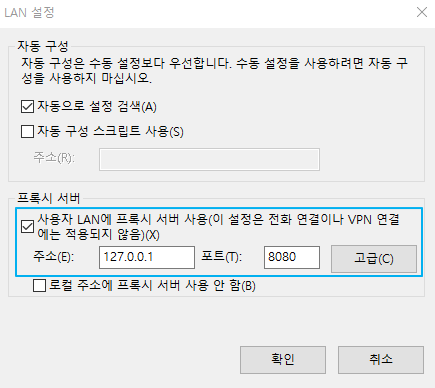 - '프록시 서버' - '사용자 LAN에 프록시 서버 사용' 체크 - 주소 및 포트 설정(디폴트 설정 - 127.0.0.1/8080)