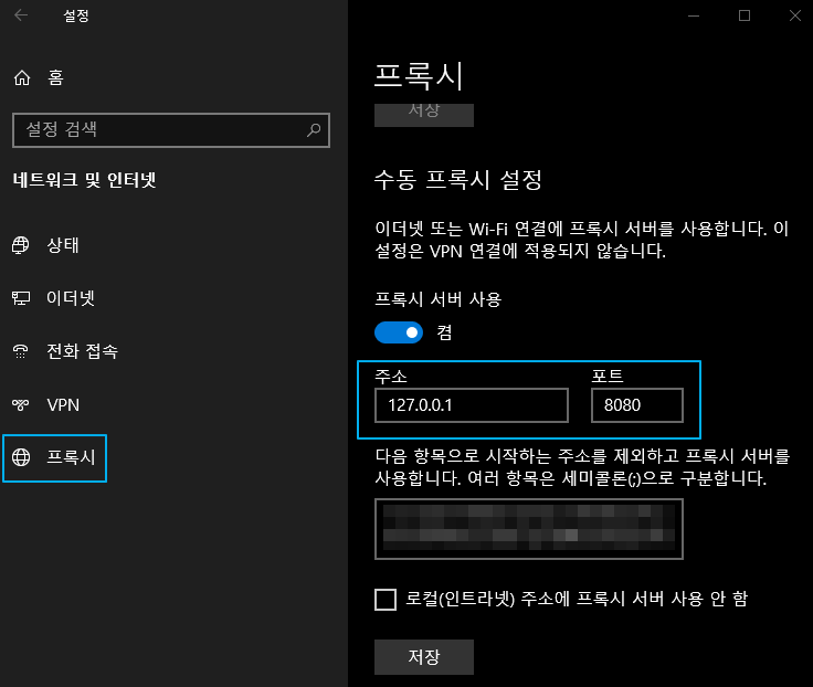 - '프록시' - '수동 프록시 설정' - '프록시 서버 사용' 체크 - 주소 및 포트 설정 - '저장'