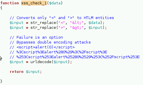 Ex) Hig 레벨 시큐어 코딩 ('htmlspecialchars' 를 이용하여 특수문자를 UTF-8로 반환)