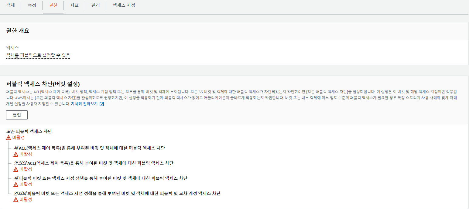 3) 버킷 > 권한 > 퍼블릭 액세스 차단 비활성화 - 외부에서 버킷 접속을 위한 설정
