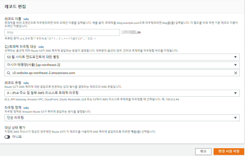 2) 레코드 편집 > 값/트래픽 라우팅 대상 > "S3 웹 사이트 엔드포인트에 대한 별칭 - 리전 선택"