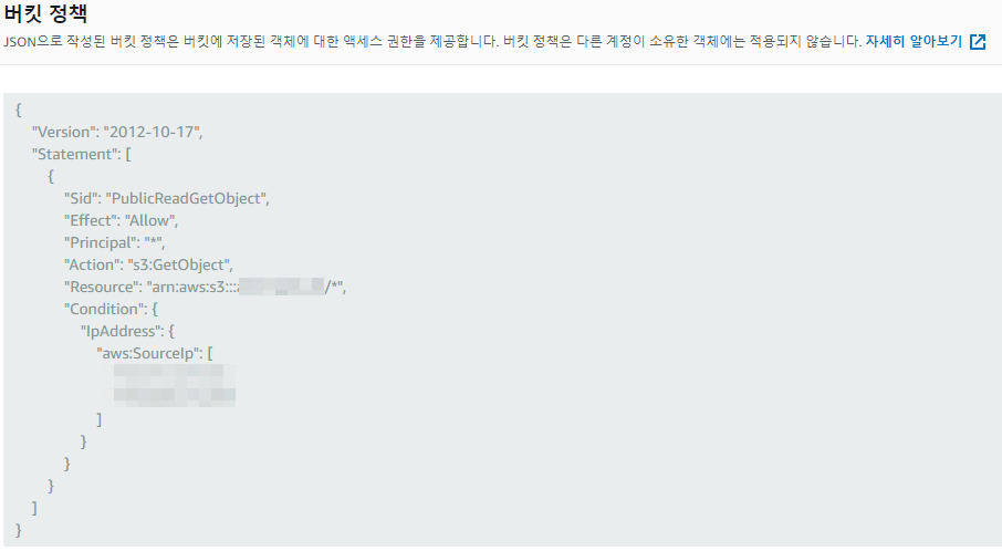 4) 버킷 > 권한 > 버킷 정책 - s3 객체 접근 및 IP 제한을 위한 설정
