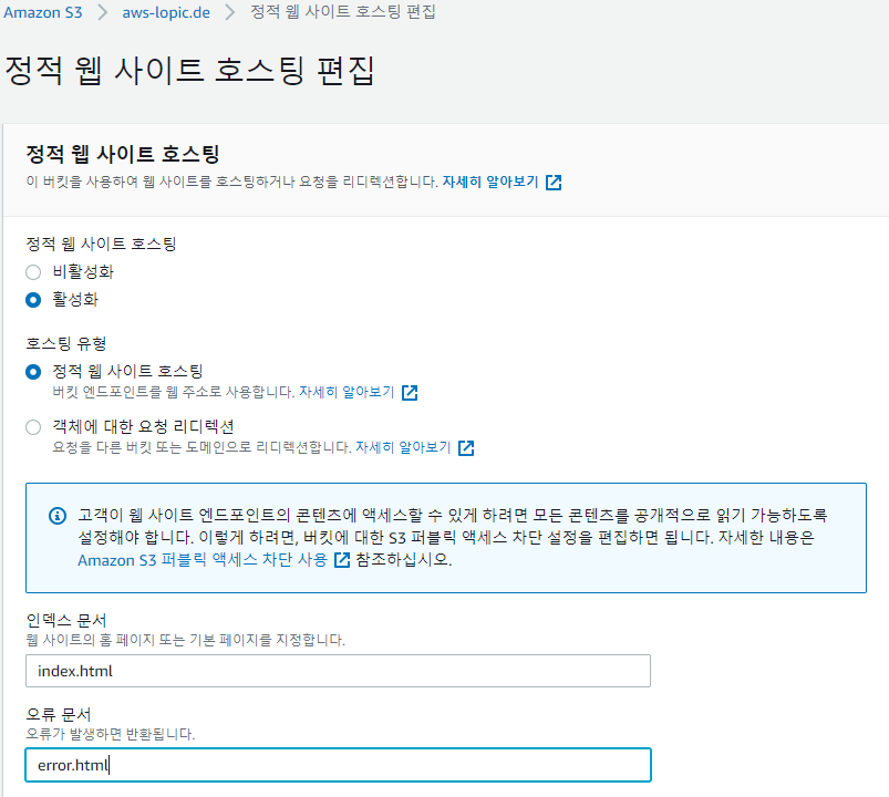 2) 버킷 > 속성 > 정적 웹사이트 호스팅 편집 - 아래와 같이 설정