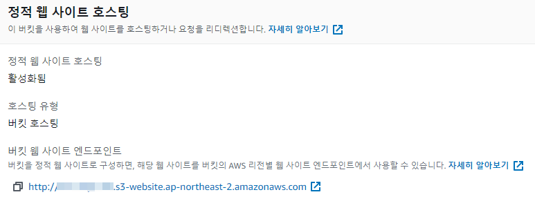 5) 버킷 > 속성 > 정적 웹 사이트 호스팅 > 엔드포인트 주소 접속