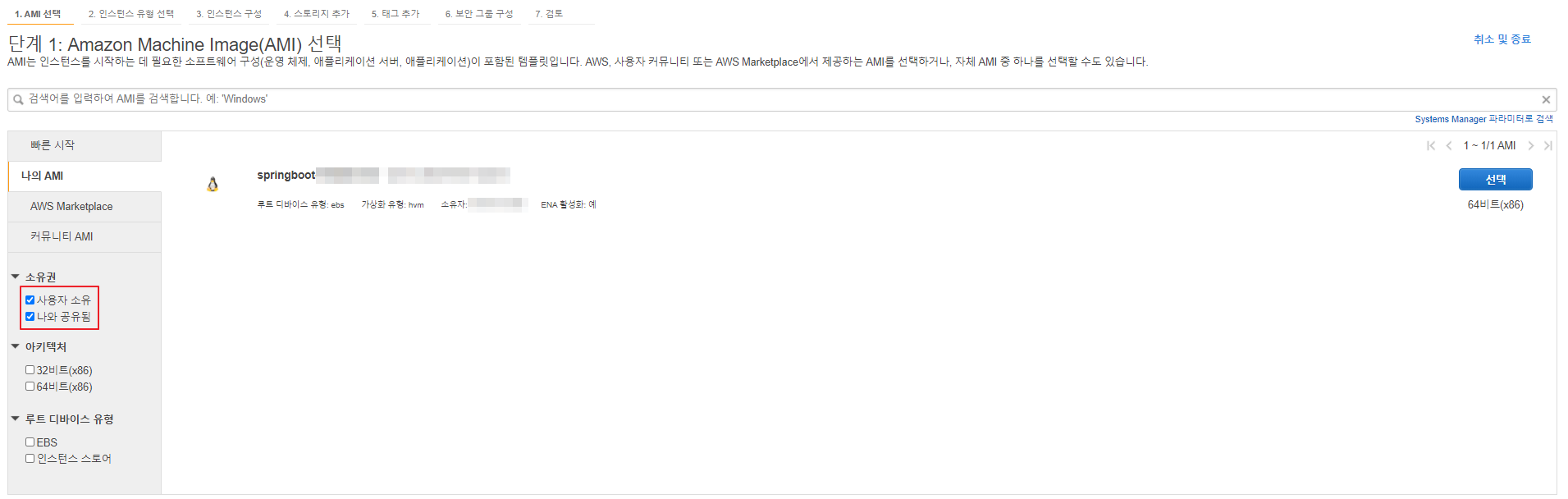 5) 이미지를 사용할 AWS 계정에서 EC2 생성 > AMI 선택 > 나의 AMI > 소유권 '나와 공유됨' 선택 > 공유된 AMI 선택