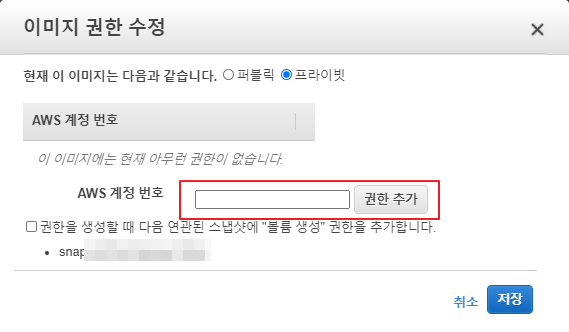 4) 이미지 권한 수정 - 해당 이미지를 사용할 AWS 계정 번호를 입력 후 권한 추가