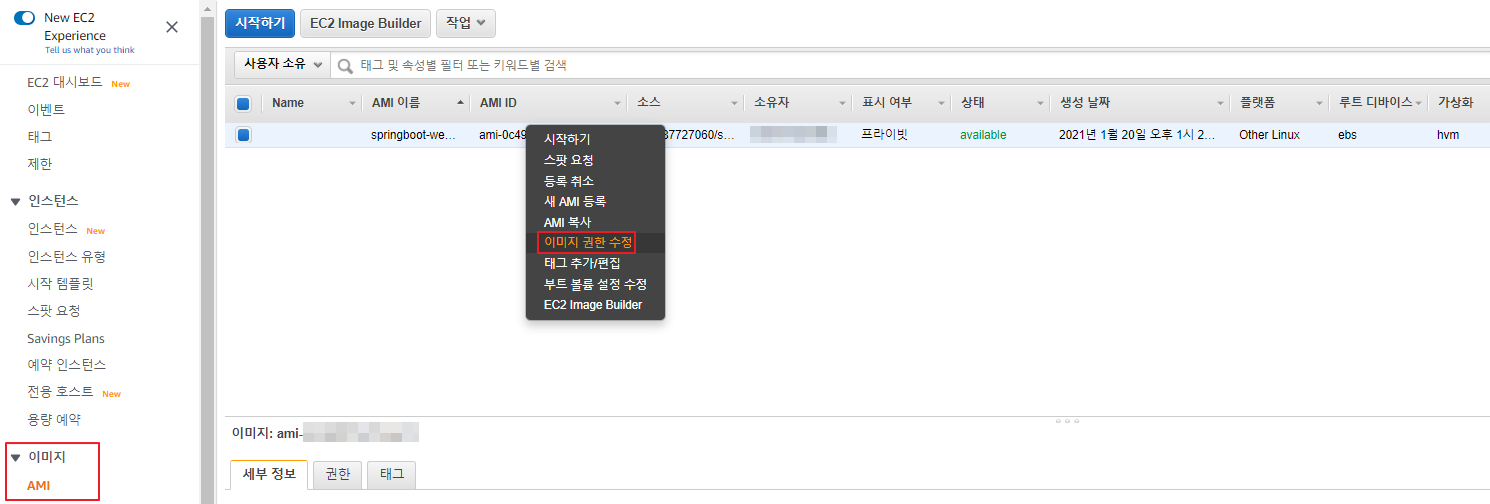 3) 이미지 > AMI - 생성된 이미지 선택 후 '이미지 권한 수정'