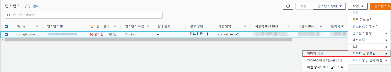 1) 사용 중인 인스턴스 중지 후 이미지 생성