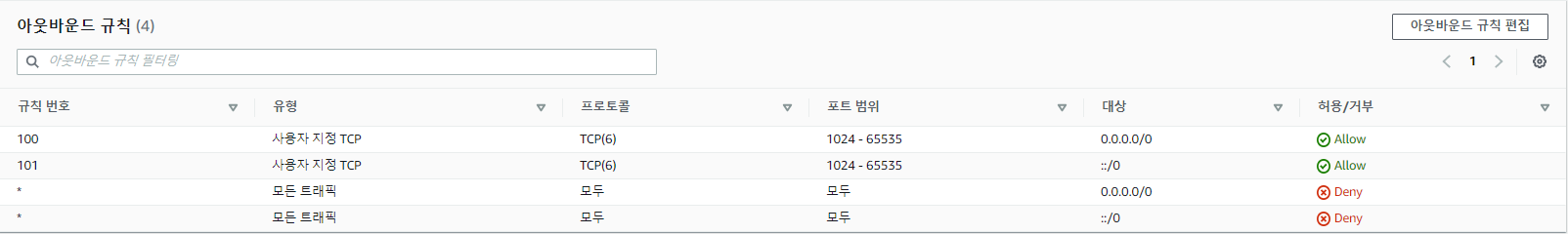 - IPv6 로 접근하는 클라이언트 및 VPC 내 IPv6 설정이 되어 있는 경우 IPv6 도 인/아웃 바운드 설정 필요.
