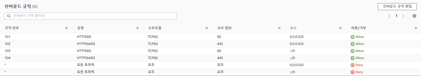 - Allow 설정만 가능하므로 허용하지 않은 모든 소스IP 및 포트 차단.
