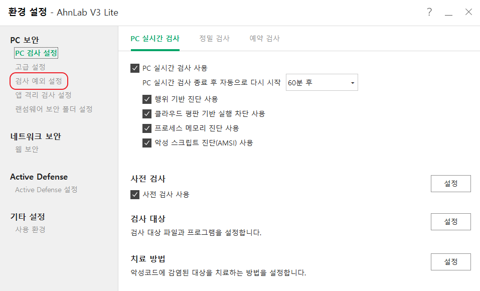 2) PC 보안 - 검사 예외 설정 클릭