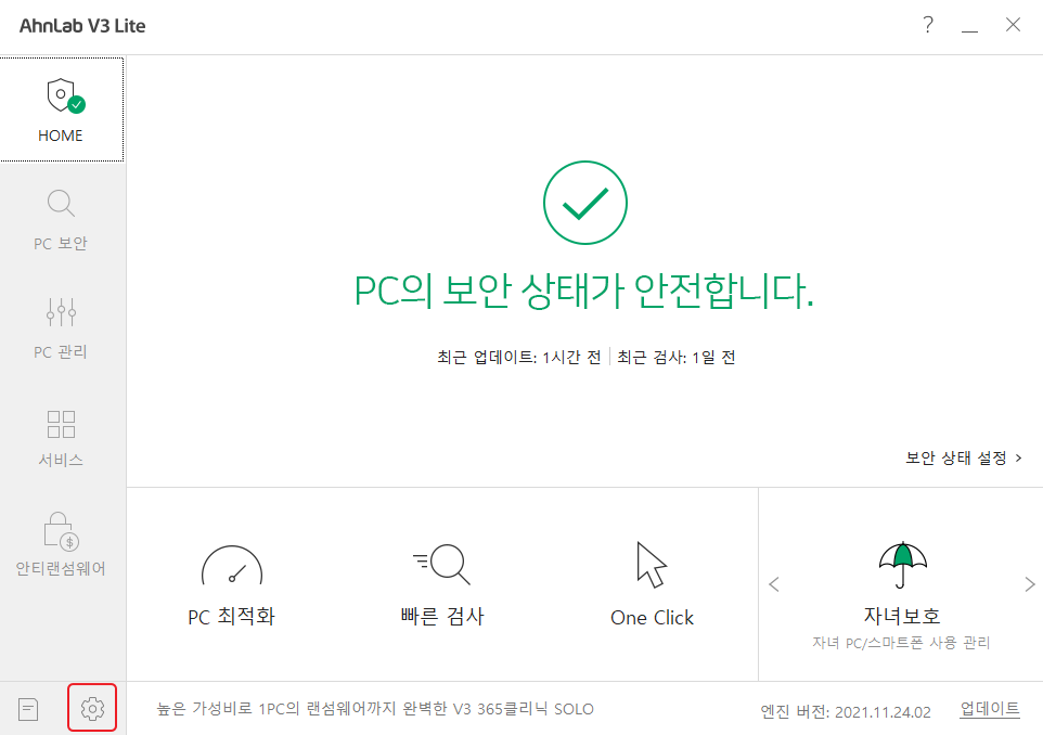 1) V3 Lite 메인 화면 좌측 하단 "톱니바퀴" 클릭