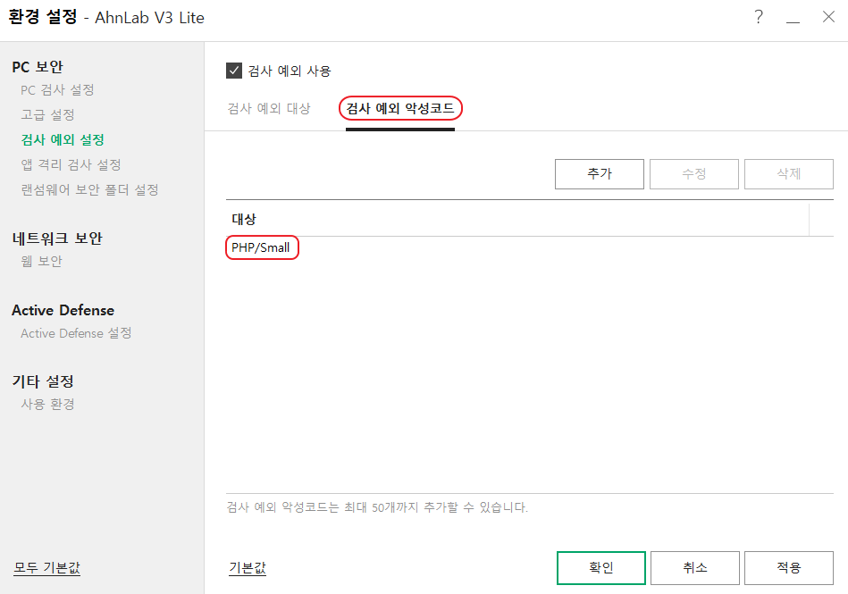 V3 Lite 검사 예외 악성코드 설정