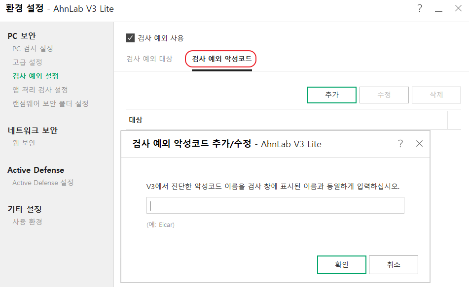 * 특정 악성코드 진단명에 대해 탐지 예외하므로 원하는 파일 외 다른 악성코드도 탐지하지 않을 수 있으므로 주위가 필요합니다.