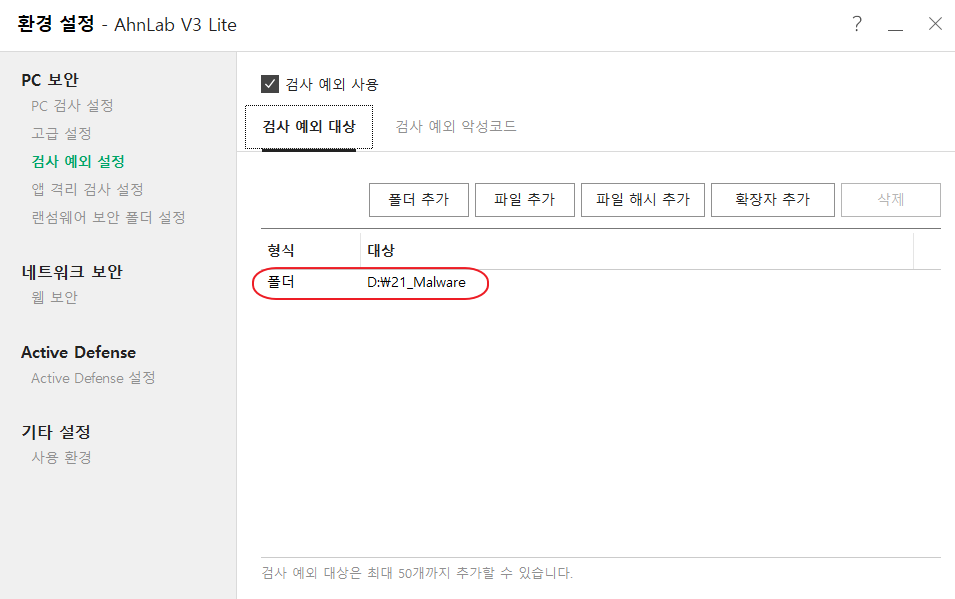 * 검사 예외 설정 시 악성코드가 탐지 되지 않으므로 예외 파일 위험도를 정확하게 판단하고 예외처리 해야합니다.
