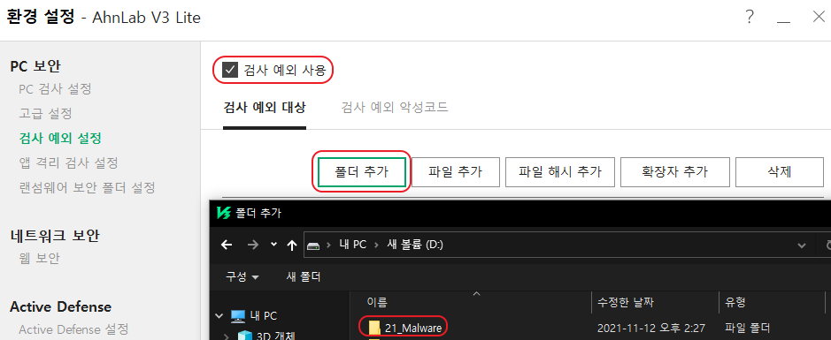 3) "검사 예외 사용" 체크 - "폴더 추가" - 검사 예외 폴더 선택
