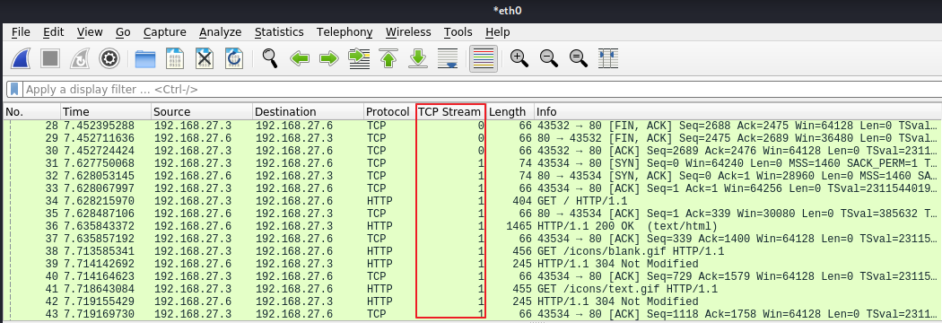 The Stream Index column displays a unique number for each stream, such as 1 for the first stream, 2 for the second stream, et cetera. A stream is a related collection of TCP packets, typically beginning with the 3-way handshake, then the data transfer, an