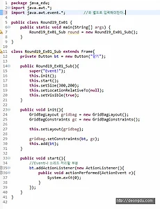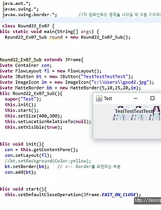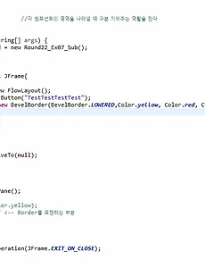 자바 스윙 보더 - MatteBorder, TitledBorder, CompoundBorder 8개 중 3개의 스윙 보더입니다. MatteBorder - 테두리의 두게를 설정하여 라인이나 이미지를 넣을 수 있는 보더 생성자에는 new MatteBorder(테두리 두께 위, 왼쪽, 아래, 오른쪽, 이미지 객체) 이렇게 구성할 수 있습니다. ImageIcon을 통해서 이미지 객체를 생성한 이후에 테투리의 두께를 설정하고 객체에 이미지를 넣었습니다. TitledBorder - 컴포넌트 주위로 제목을 줄 수 있는 보더. 라인과 같은 다른 보더의 효과도 함께 줄 수 있습니다. - 컴포넌트 위나 아래에 제목을 네모난 제목을 넣어주는 보더 생성자 구성 - new TittledBorder(제목 붙일 객체, 제목, 객체..